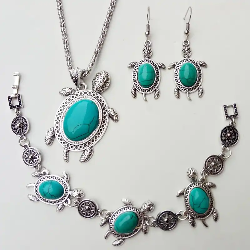 Vintage Turkish Jewelry Sets Small Turtles Pendant Necklace Earrings Bracelet Jewelry Set For Women Girls Jewelry Gifts