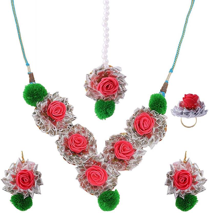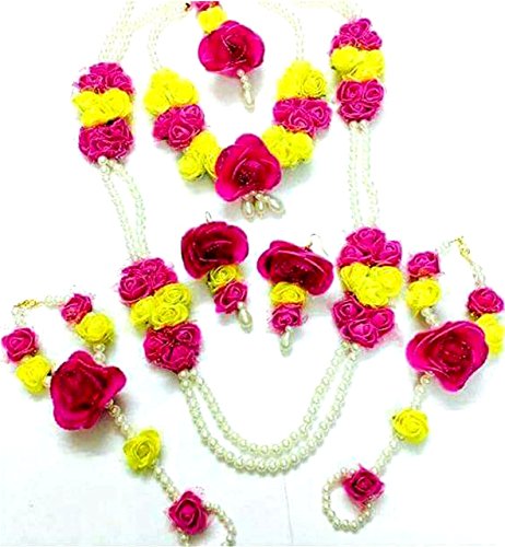 Floret Jewellery Pearl Pink Yellow Flower Jewellery Set For Women Girls Mehandi Haldi Wedding